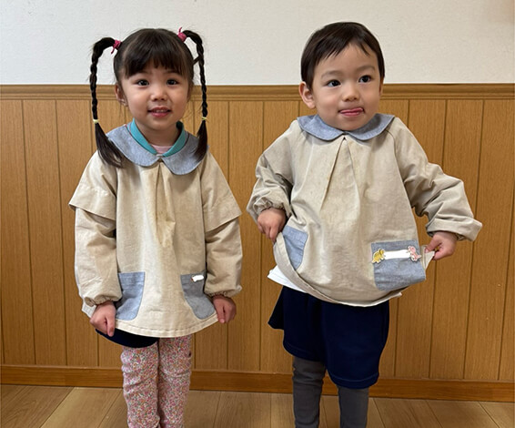 園指定の体操服で登園していただきます。登園後は活動着であるスモックを着用し、午前の活動を行います。志免さくらこども園では園外保育を重視しているため、どこにいても当園の園児であることが分かるようにするためです。ご協力をお願いします。