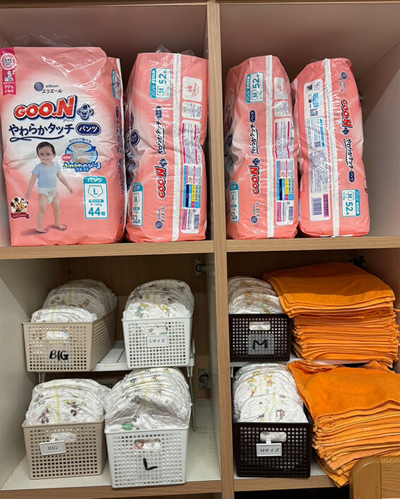 本サービスにより、紙おむつ・食事用エプロン・タオル等は園で準備いたしますので、ご家庭からの持参は不要となり、朝の当園準備も不要となります。